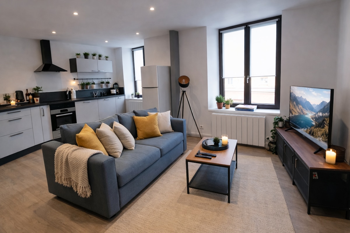 Muy luminoso y situado a dos pasos del centro de la ciudad, y a 10 minutos a pie del centro histórico y del Technom, este apartamento goza de una ubicación ideal. Con sus dos dormitorios, una gran sala de estar con zona de dormitorio, una cocina equipada, un baño con aseo separado y una pequeña zona al aire libre, este alojamiento de 84 m² es una escala ideal para grupos. Comercios, restaurantes y servicios están en las inmediaciones (panadería, supermercado, restaurantes, gimnasio, bancos, etc.).