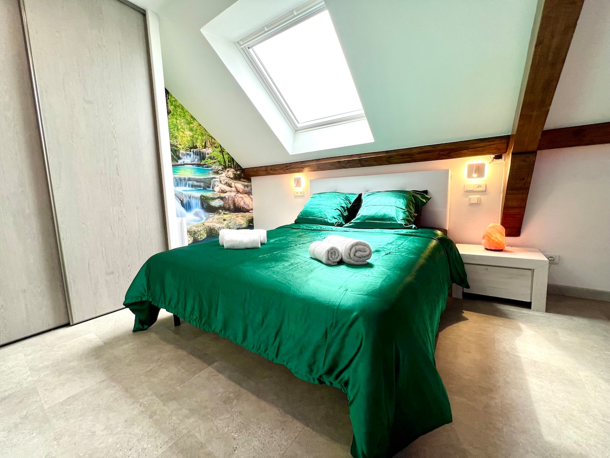 La Suit's Charmes le da la bienvenida en un ambiente cálido, acogedor y relajante. Soñar, descansar, mirarse, sentirse, abrazarse, reencontrarse, confinarse…amarse…¡Venga a disfrutar de los encantos de la suite! Suite de 75 m2, frente a la estación de Belfort Jacuzzi Sauna Cama King Size TV 4K smart TV, Netflix, TV Orange Wifi Chimenea Cielo estrellado Ducha XXL multichorros (cielo de ducha no disponible hasta la fecha) Se proporciona toda la ropa de cama Opción posible: columpio erótico/ champán/ electrodoméstico party