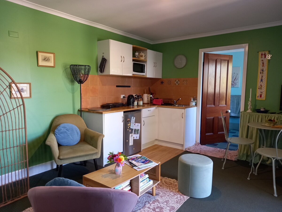 Keep it simple at this peaceful motel-style guest suite. This delightful apartment is a great home base for visiting Bellingen. The bed is comfy, the neighbourhood is quiet (except for all the birds), and it's only 1.4 km from all the fabulous cafes, restaurants and shops in town. Featuring local timber and handmade items, it's very Bello. Regrettably, the suite is not appropriate for babies or children, and can only accommodate 2 guests.