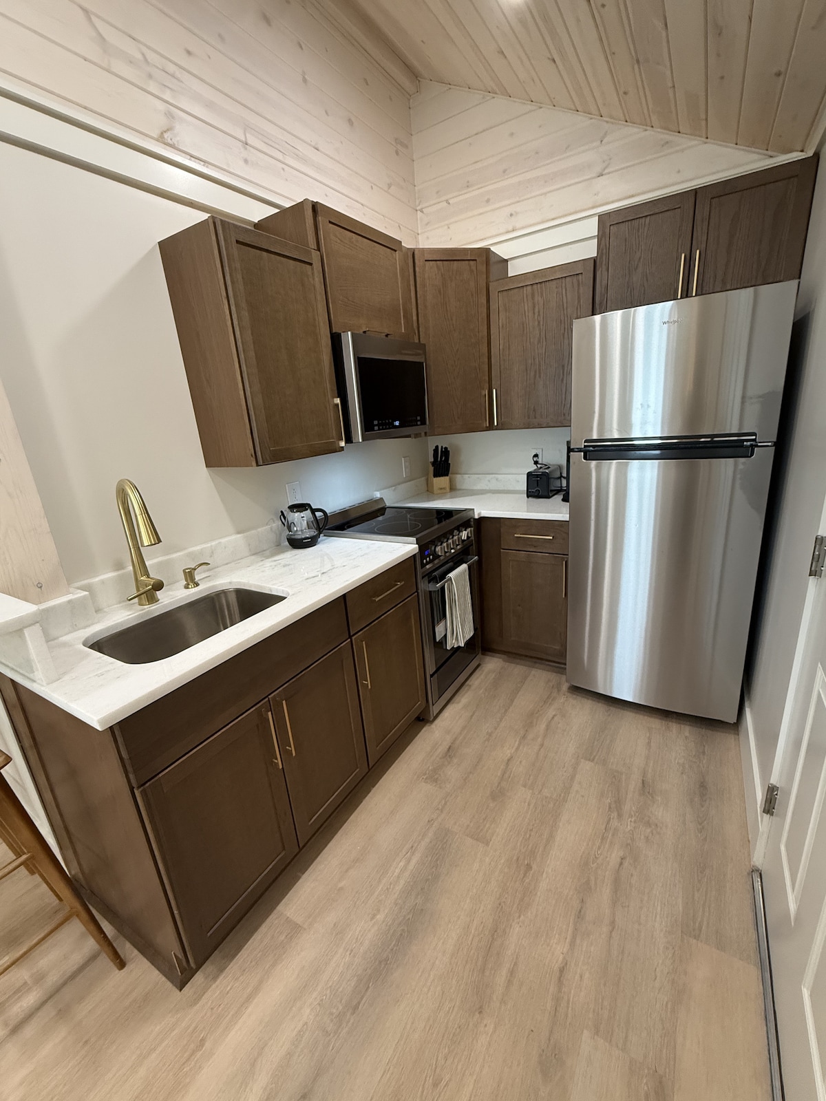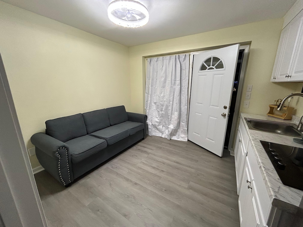 Este es un apartamento anexo conectado al garaje de nuestra casa con tres salidas/entradas. Una es la entrada principal con tu código específico. La segunda puerta está cerrada con cerrojo desde tu lado y conduce al garaje que ves en la foto. La tercera está cerrada con cerrojo en tu lado y te da acceso al patio trasero. La seguridad y la privacidad son muy similares a las de una habitación de hotel. Ten en cuenta que rara vez nos reunimos o interactuamos con nuestros huéspedes.
