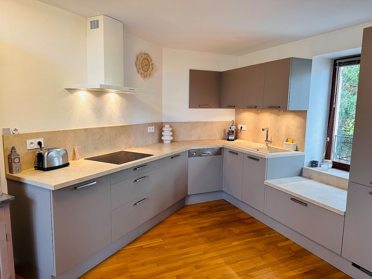 A 20 minutos de Lyon, a las puertas del Beaujolais, en absoluta tranquilidad. Originalmente salón de aparato del castillo, este alojamiento ha sido completamente rehabilitado, combinando su encanto e historia con una renovación moderna y funcional. Espacio abierto al campo, cocina moderna y perfectamente equipada, baño moderno, gran ducha e inodoro japonés. Dormitorio, ropa de cama tamaño queen, acceso directo a la terraza. Exterior bucólico, terraza de doble exposición. Piscina compartida.