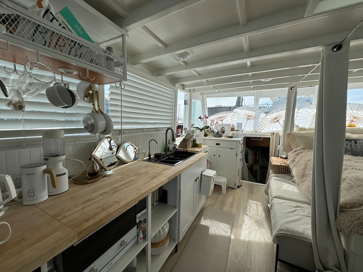 Romántico apartamento flotante con impresionantes vistas al mar. Relájate y disfruta de una escapada tranquila con estilo y comodidad. Contempla el amanecer desde tu súper cómoda cama o relájate en la terraza con pelícanos ocasionales (o incluso un hidroavión) yendo y viniendo. Único y perfecto para una escapada, trabajo o retiro. El puente Golden Gate está a 6 minutos. El autobús del aeropuerto para a una manzana de distancia. Camino/ruta en bicicleta a Sausalito y Mill Valley. Ferry/autobús a SF. Aparcamiento gratuito. ¡Lee las reseñas de este o de nuestros otros 3 apartamentos flotantes!
