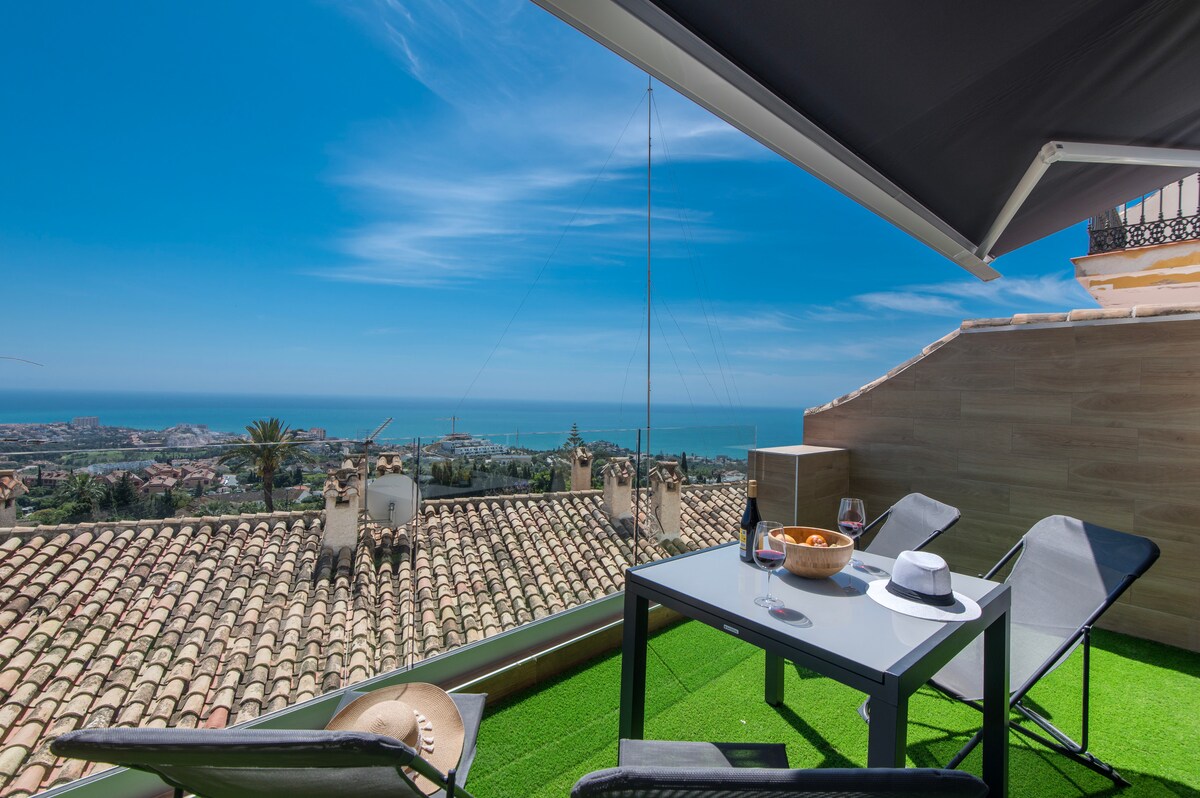 Hermoso ático con una gran terraza moderna y vistas al mar virgen con vistas al mar Mediterráneo y a las montañas. Desde la terraza se puede disfrutar de la puesta de sol perfecta. Excelente ubicación (a solo 20 minutos del aeropuerto) en el complejo vacacional de Benalbeach junto a la playa. Toda la decoración y el mobiliario se han preparado con buen gusto pensando en el disfrute de nuestros huéspedes y es ideal para pasar tus mejores vacaciones de verano, así como la temporada de invierno en la zona costera de Benalmádena.