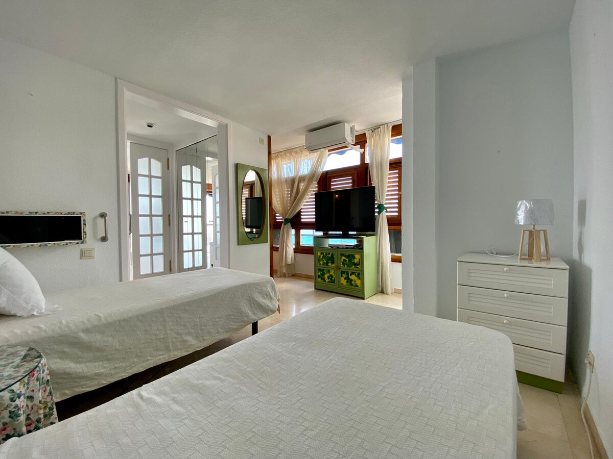 Apartamento de 2 habitaciones para 4 personas en primera línea de la playa Poniente, con vistas de la playa y el mar, terraza grande con vistas, todo exterior, salon amplio con vistas al mar, aparcamiento privado, wifi, TV, aire acondicionado, cocina completa (lavavajillas, lavadora, horno), baño completo, en urbanización con piscina, jardín muy bonito con vistas al mar y pista de tenis. La urbanización tiene acceso directo al paseo maritimo y es una de las más bonitas de la playa de Poniente.