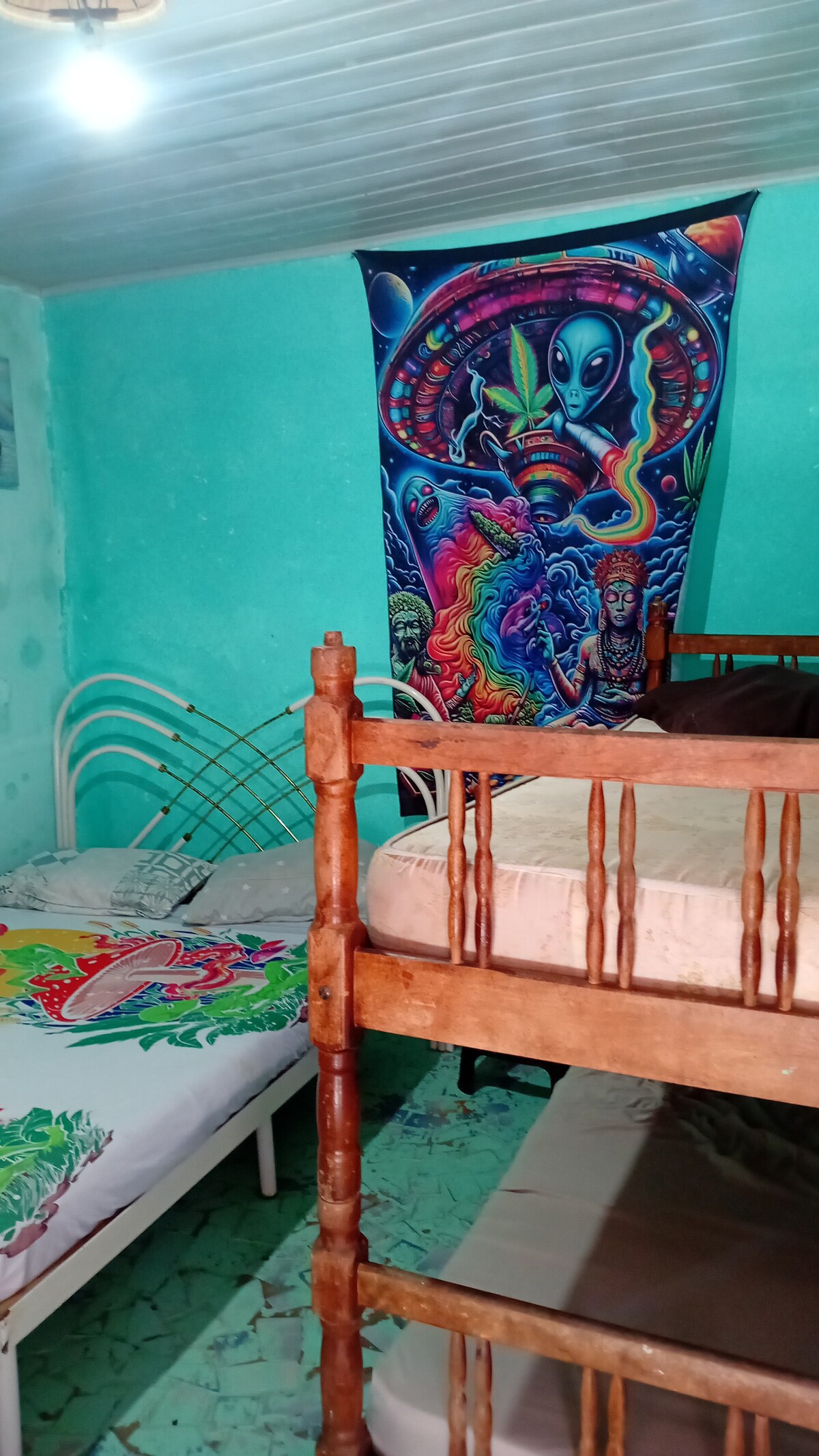 Casa adosada (solo planta superior) 1 dormitorio (con 1 cama doble queen + 2 colchones individuales sueltos), 1 baño, sala de estar, cocina americana (1 nevera duplex). Ventilador de techo en el dormitorio y en la sala de estar. 1 ventilador de pie. Toda la casa 220V Altillo con 1 colchón individual. Para 5 personas. Traer ropa de cama, mesa y baño.