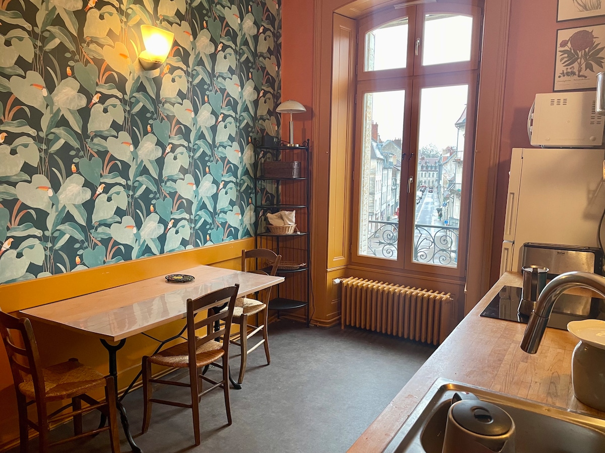 Appartement 60 m2 dans hôtel particulier XVIII donnant sur jardin, très calme. Deux pièces: une chambre, une salle de bain, un salon-cuisine équipée. Un grand lit deux places et un canapé deux places. Possibilité d'un petit lit de bébé à rajouter. L’appartement est situé au second étage. Il est strictement « non fumeur ». Un local à vélos est disponible pour vous permettre un arrêt en toute sécurité. Grand parking public gratuit à côté de l'appartement.Centre ville de Dole à 2 mn à pied.