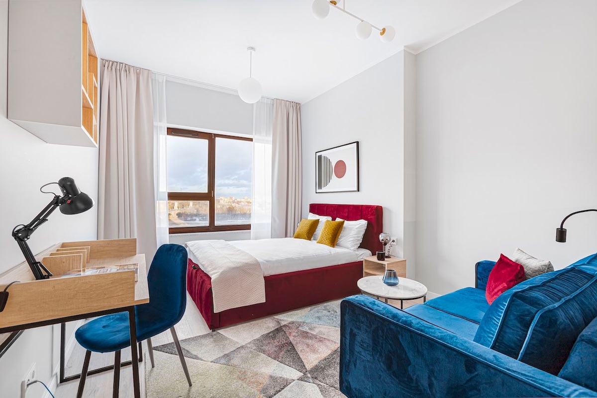 Un departamento atmosférico en los bulevares de Vístula con una cocina separada y sala de estar conectada al comedor. Un baño con ducha y dos dormitorios independientes, y un encantador balcón. A solo 12 minutos de la estación central y a 800 metros de los bulevares, alrededor del parque, vegetación. Ideal para 2-4 personas+ cama adicional para 2 personas (sofá). Cocina con lavadora, sala de estar con SmartTV conectada al comedor, wifi rápido. En ambos dormitorios, armarios grandes y un escritorio para trabajar en uno, y un baño estético con ducha.