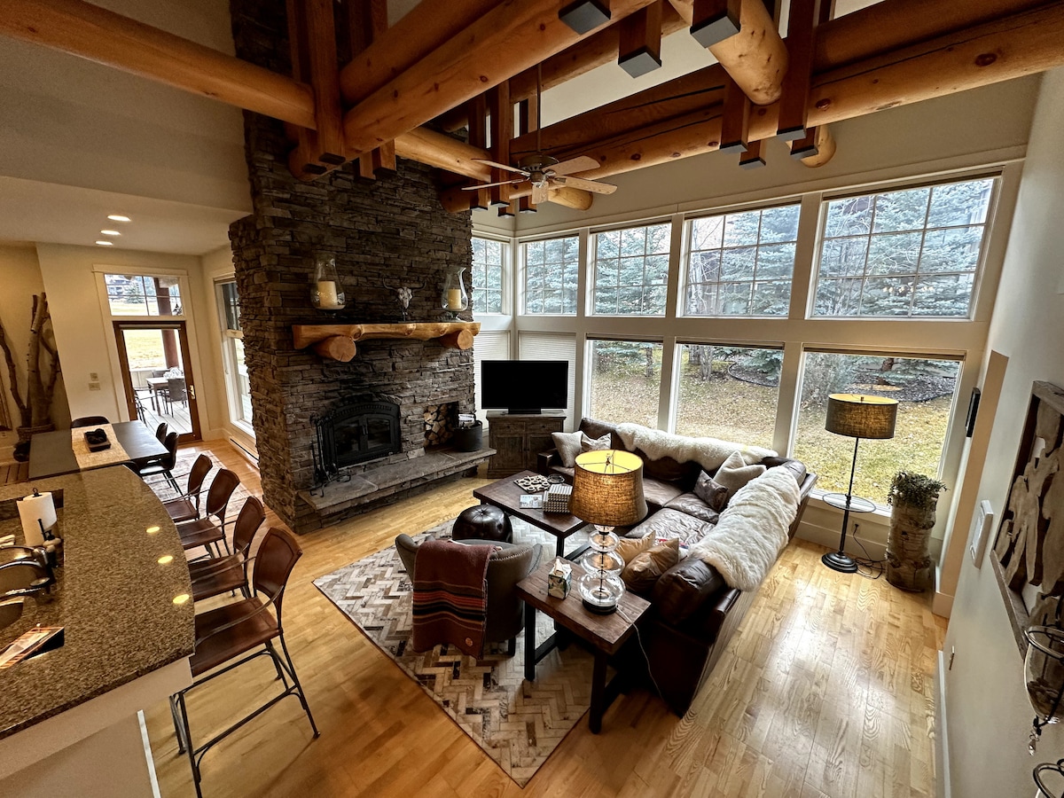 Entrarás en este condominio e inmediatamente te sentirás más ligero de pie; ¡no puedes evitar respirar profundamente! ¡Ya lo lograste! Y no puedes olvidar dónde estás porque esa enorme montaña solitaria está justo en tu cara por todas las ventanas. El arquitecto de este lugar simplemente no se perdió el ritmo, ¡un diseño con el flujo espacioso perfecto! La sala de sol principal en suite sobresale sobre los árboles, con una impresionante GRAN vista a la montaña. Desde la puerta principal, estás a 7 minutos en auto o en transporte de estar en