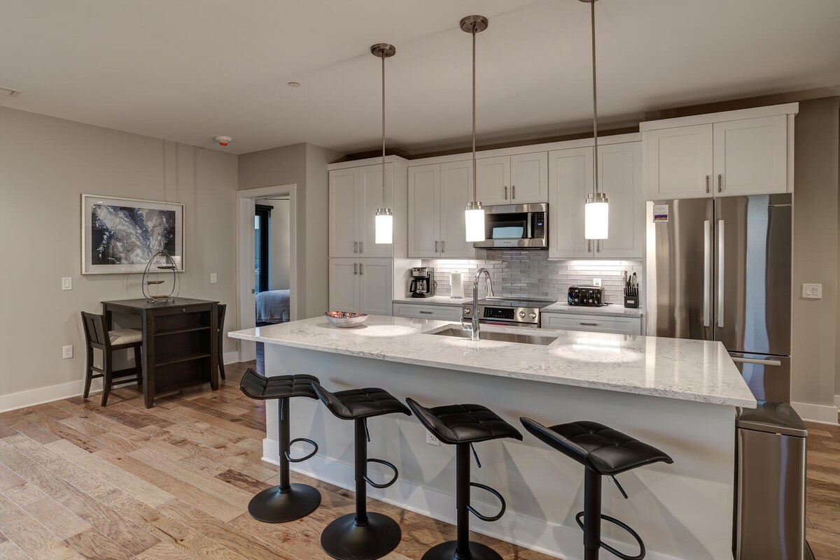 Stay in the heart of Downtown Asheville in the beautiful 55 South Market building! Located just steps from the vibrant South Slope and Biltmore Avenue, this one-bedroom unit was built in 2018 and features designer furnishings, work by local artists, and everything you need to have a comfortable stay. The unit has a king-sized bed in the bedroom along with a full-size sleeper sofa in the living room. The spacious bathroom has a double vanity and large shower to accommodate multiple guests. There's also a washer/dryer if you need to freshen up your wardrobe while you're here!