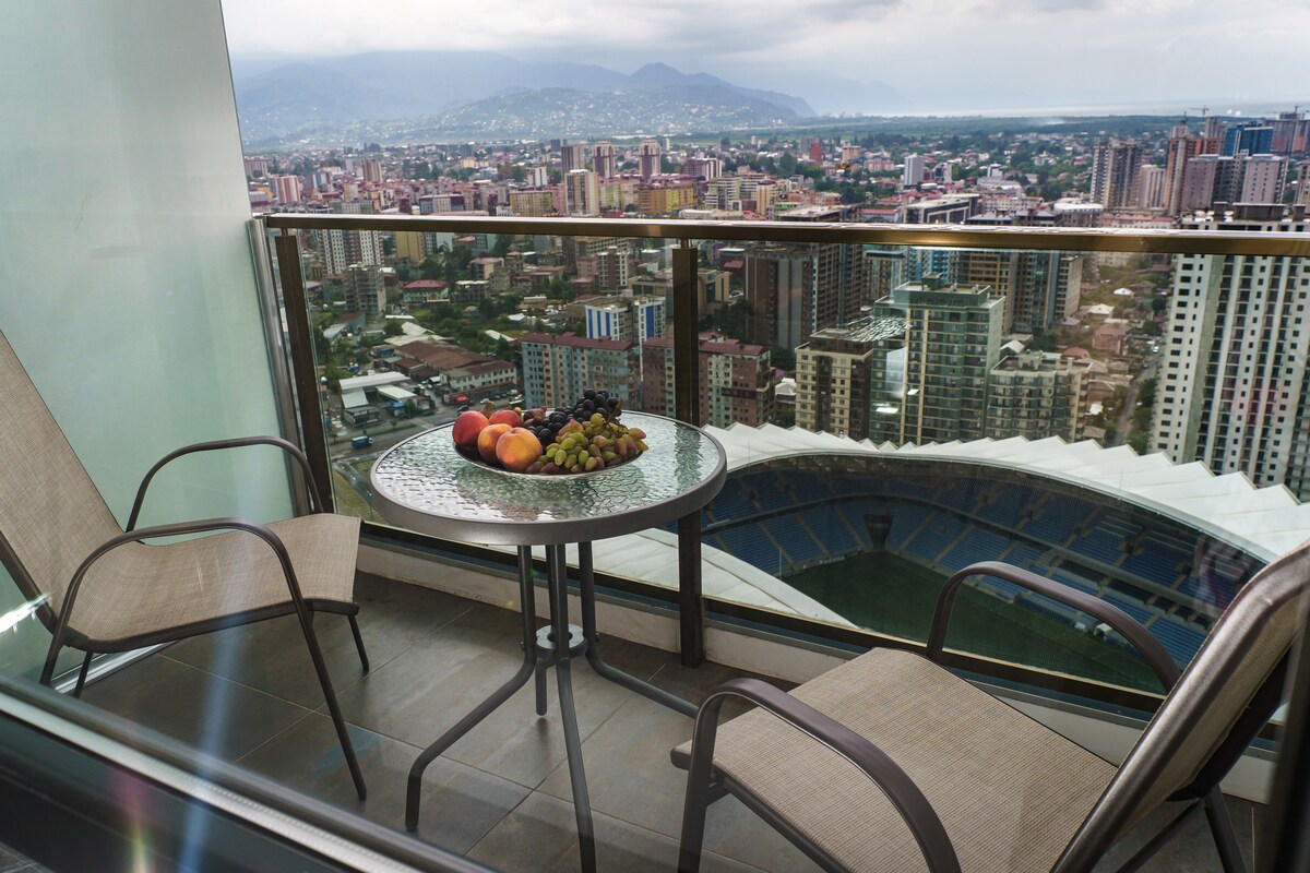 Apartamento con vista panorámica de 180 grados de Batumi. Puedes ver el amanecer desde tu dormitorio por la mañana y la puesta de sol por la noche. Desde el balcón hay una vista chic del estadio de fútbol Arena Batumi. Centro comercial a 30 metros (supermercado, farmacia, etc.). El mar está a pocos minutos a pie. Apartamento con una vista panorámica de 180 grados de Batumi. Desde el balcón hay una vista chic del estadio de fútbol Arena Batumi. Centro comercial a 30 metros (supermercado, farmacia, etc.). El mar está a cinco minutos a pie.