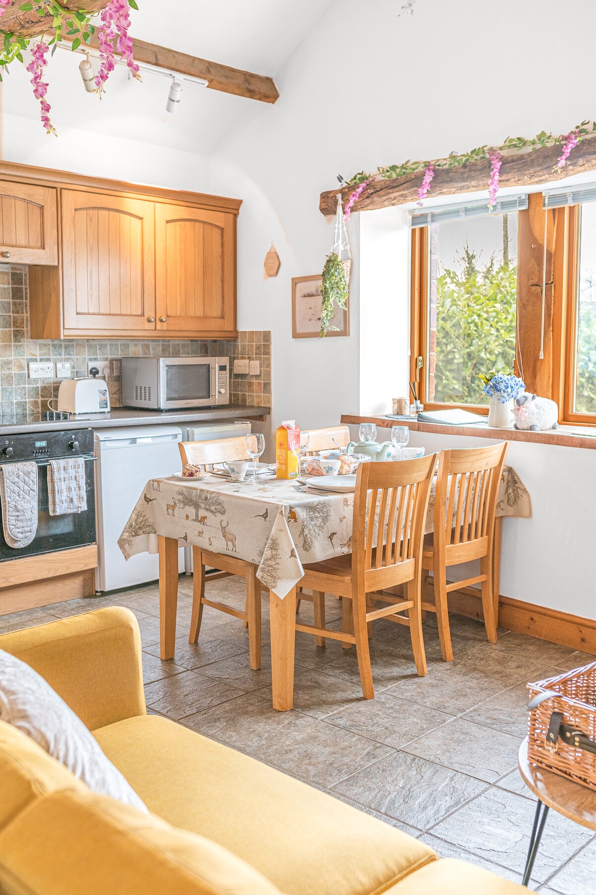 Complete with a fully fitted kitchen and a dining table for two, enjoy home cooked meals in this beautiful barn conversion. The living area is furnished with a leather sofa, a TV and an electric fire. The bedroom is separated from the living room. Furnished with a Kingsize bed, bedside shelves and a mirror this studio offers everything you need. The bathroom is fitted with a large walk-in shower and modern tiles. The skylight above allows natural light to stream into the property.