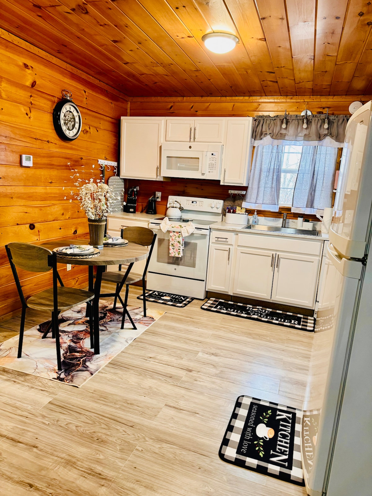 1 acre of private-peaceful bliss! New 65 in tv, linens, kitchen stock, washer/dryer, coffee pot, coffee, tea. Lots of towels, tons/pillows, throws/blankets ,Shampoo, conditioner, soap, jacuzzi, hot tub, covered porch, deck , fire pit, and so much more! You won’t have to leave! groceries delivered! Close to winery, coffee house, restaurants, you can walk , but feel like you are alone!! Cades Cove, Mountains within minutes! Biking trails, hiking, rafting and kayaking! Discounts, yes