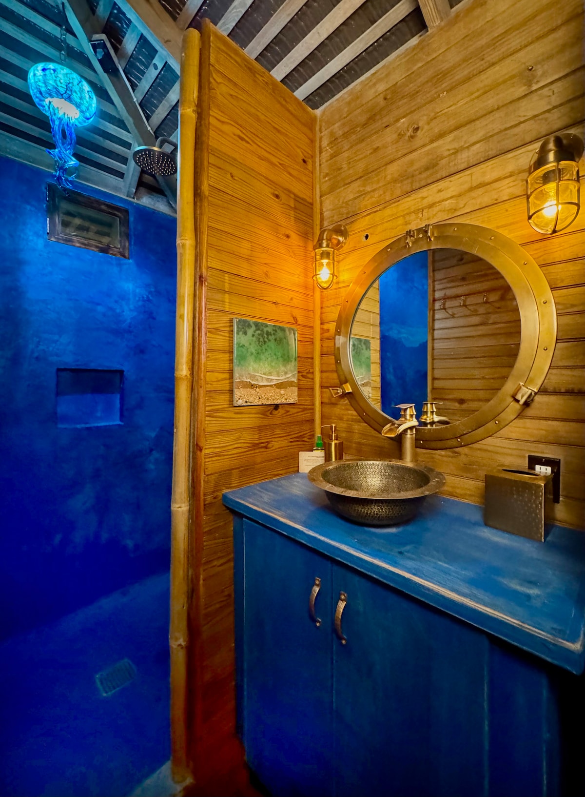 This cozy waterfront cabin is ideal for a couple or tight-knit family. The cabin features an upstairs loft for catching the sunset glow and downstairs, a ‘floating’ sofa/bed that overlooks a vibrant coral reef. When night falls, bioluminescent plankton illuminate the water - magical! Jetsons-meet-Flintstones" is the vibe here. Please read the “Other things to note” section so you know what to expect!