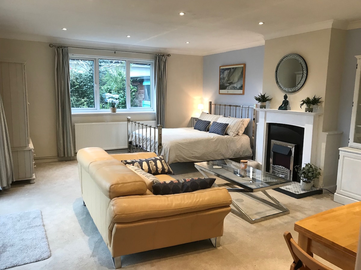 Modern garden room studio opposite Priory Park just a short stroll into Chichester city centre. Ideally located for Chichester Cathedral, Chichester Festival Theatre (CFT), New Park Cinema, Pallant House Gallery and St. Richard's Hospital. Also well positioned for Goodwood, Chichester Marina, Bosham, Dell Quay and the Witterings. Guaranteed free parking for ONE vehicle is included in your stay, either on our driveway - small to medium-size - or on-street for larger vehicle (permit provided).