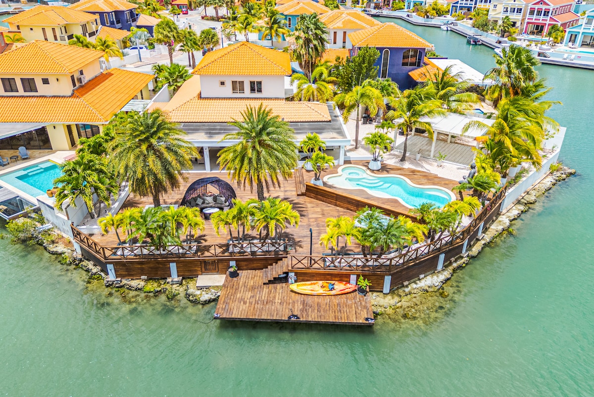 Villa nueva frente al agua situada en la exclusiva zona 'WaterVillas'. Esta hermosa villa se siente como un hogar cómodo. Situado en el centro entre las playas más hermosas de la isla, lugares de buceo, playas de cometas y el centro de Kralendijk. Te encantará la vista al mar desde la cabaña y la piscina. El muelle privado de la villa da acceso a la laguna y al océano en (alquiler) SUP, kayak o barco.