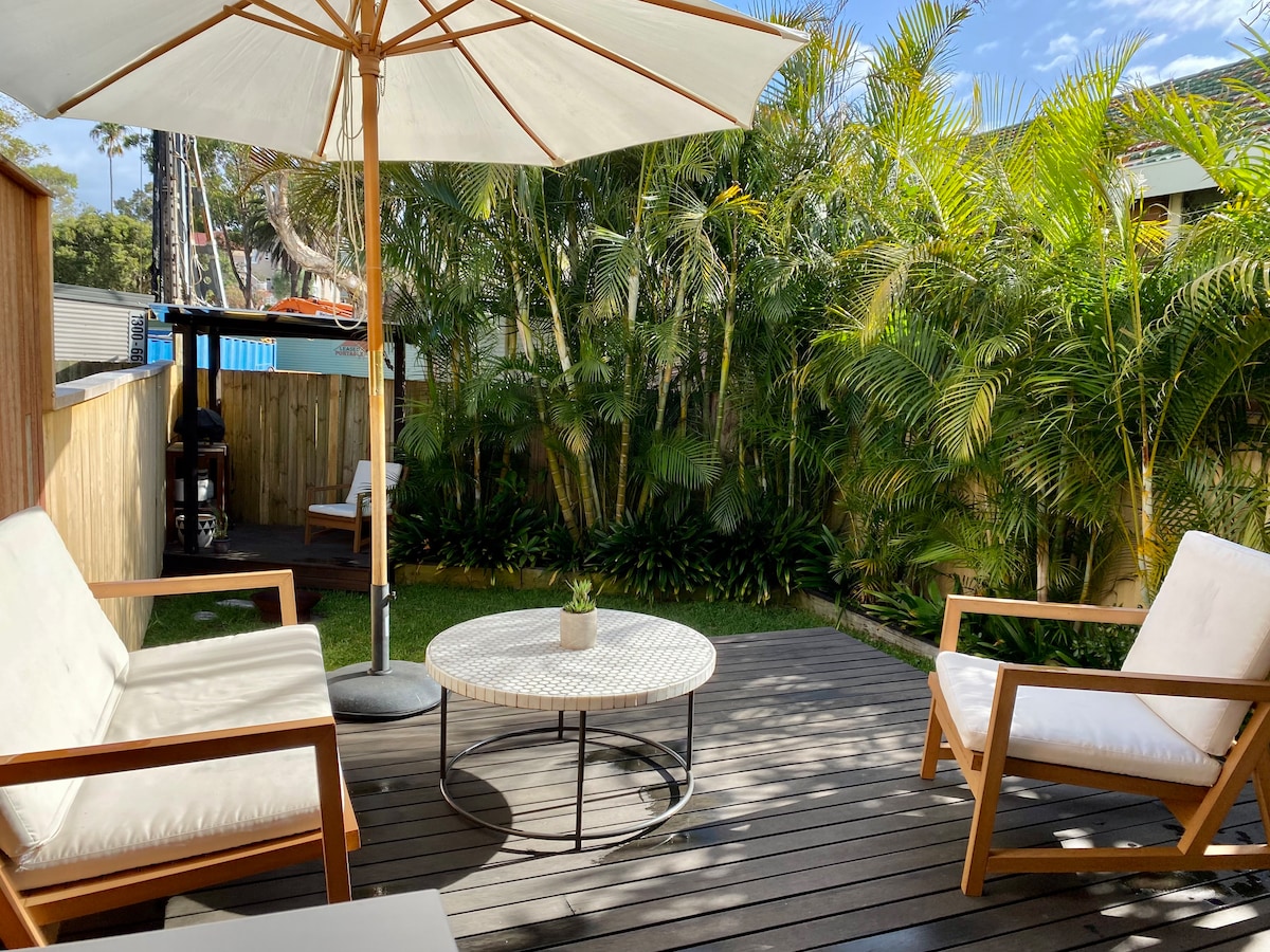Un tranquilo estudio jardín con entrada privada y patio. A pocos pasos de la playa de Collaroy y la piscina de rocas, la playa de Long Reef, Headland, el parque marino, cafés, restaurantes, supermercados, clubes, un campo de golf y canchas de tenis. Las paradas de autobús a Manly, Palm Beach y Sydney CBD están a 10 minutos caminando de Pittwater Rd. Una zona privada encubierta tiene una barbacoa y un sofá cama de día. El estudio incluye cocina pequeña separada, lavandería y baño separado. Dormitorio combinado, comedor y cómodo salón de TV.