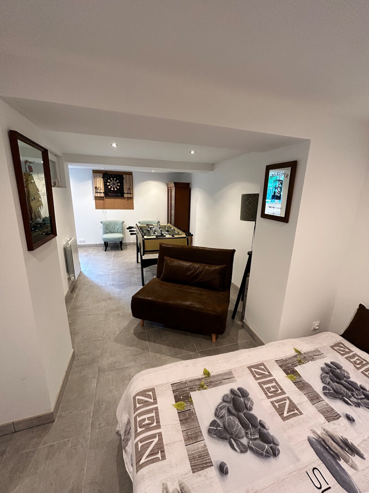 Estudio Souplex puerta independiente de 40 m2 único. Incluye: - Una cama para 2 personas (colchón de 27 cm con memoria para mayor comodidad) - una cama sofá cama una persona si son 3 con colchón de 24 cm con memoria de forma - cuarto de baño equipado - cocina equipada + mesa - Sofá de cuero - futbolín / dardos -> cerca de todas las comodidades, lo que facilita la planificación de su visita:frente a la parada de autobús que lleva a Lille en 17 minutos y frente al camino peatonal que lleva al centro de la ciudad en 5 minutos