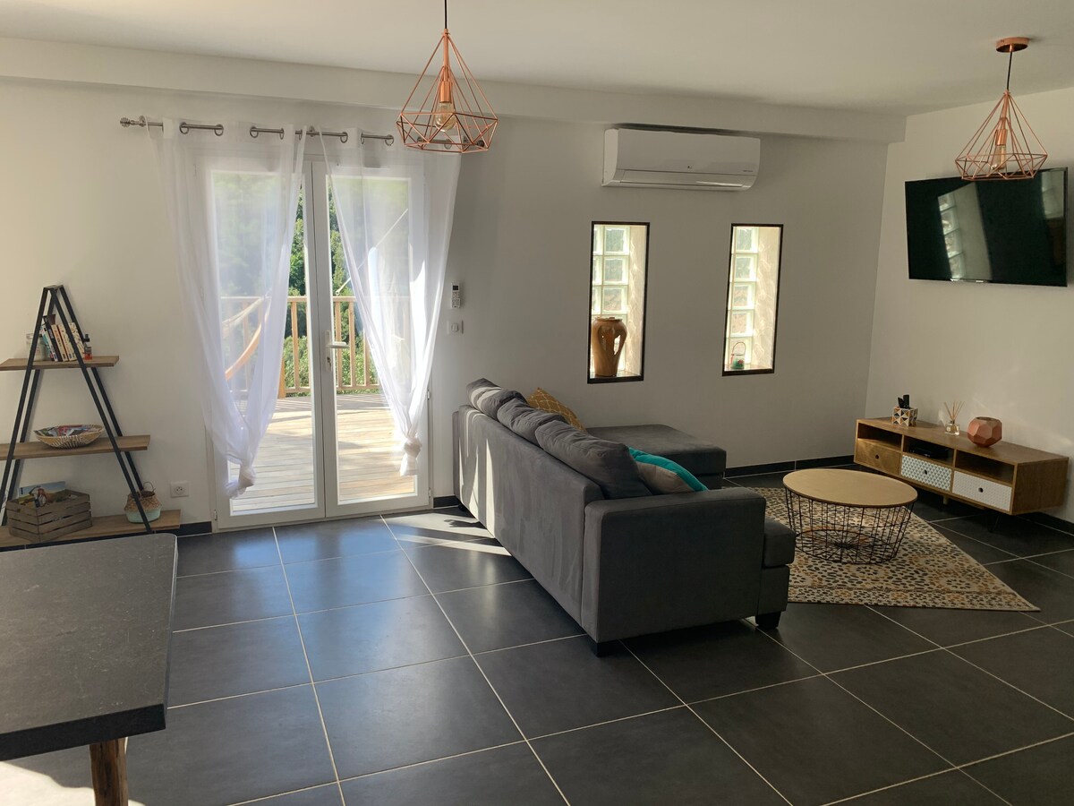 ¡Relájese en este alojamiento tranquilo y con una decoración cálida! ¡El chalet ''u castagnu ''tiene su cocina equipada, su baño privado y una acogedora zona de estar con su decoración cuidada en colores cálidos y cálidos!La cama se encuentra en el altillo (cama de 2 plazas)+1 cama en la sala de estar(cama de 1 plaza).Lo que permite ofrecer 3 camas.También tiene una terraza cubierta con mesa, sillas, baño nórdico privado, Un pequeño capullo en la naturaleza