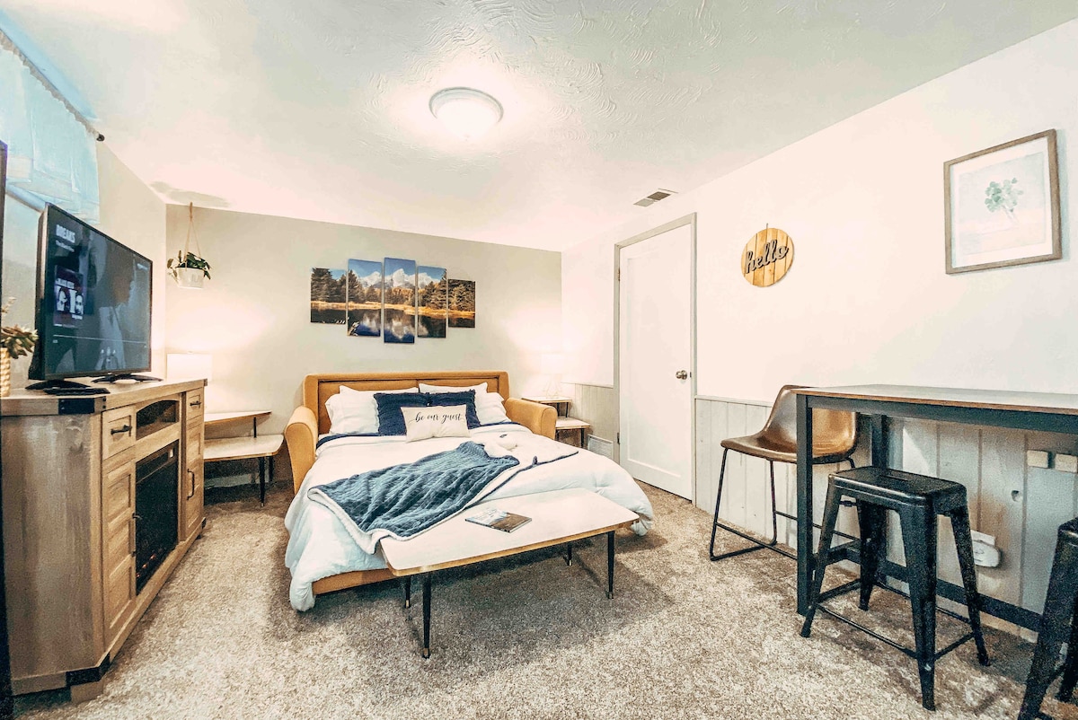¡Te damos la bienvenida a la casa de campo en 14th St! Disfruta de un acogedor y luminoso apartamento moderno de mediados de siglo en la planta baja con entrada lateral privada y código de llave. Tienes todas las comodidades de un hogar en el corazón de Idaho Falls. La enorme cama tamaño king de espuma viscoelástica y las suaves sábanas te garantizarán una excelente noche de descanso. Disfruta de una cocina totalmente equipada y juega en el patio trasero vallado apto para mascotas y niños, con jacuzzi, chimenea, patio y barbacoa. Mira películas y juega alrededor de la chimenea en el televisor inteligente de 55 pulgadas con internet de fibra.