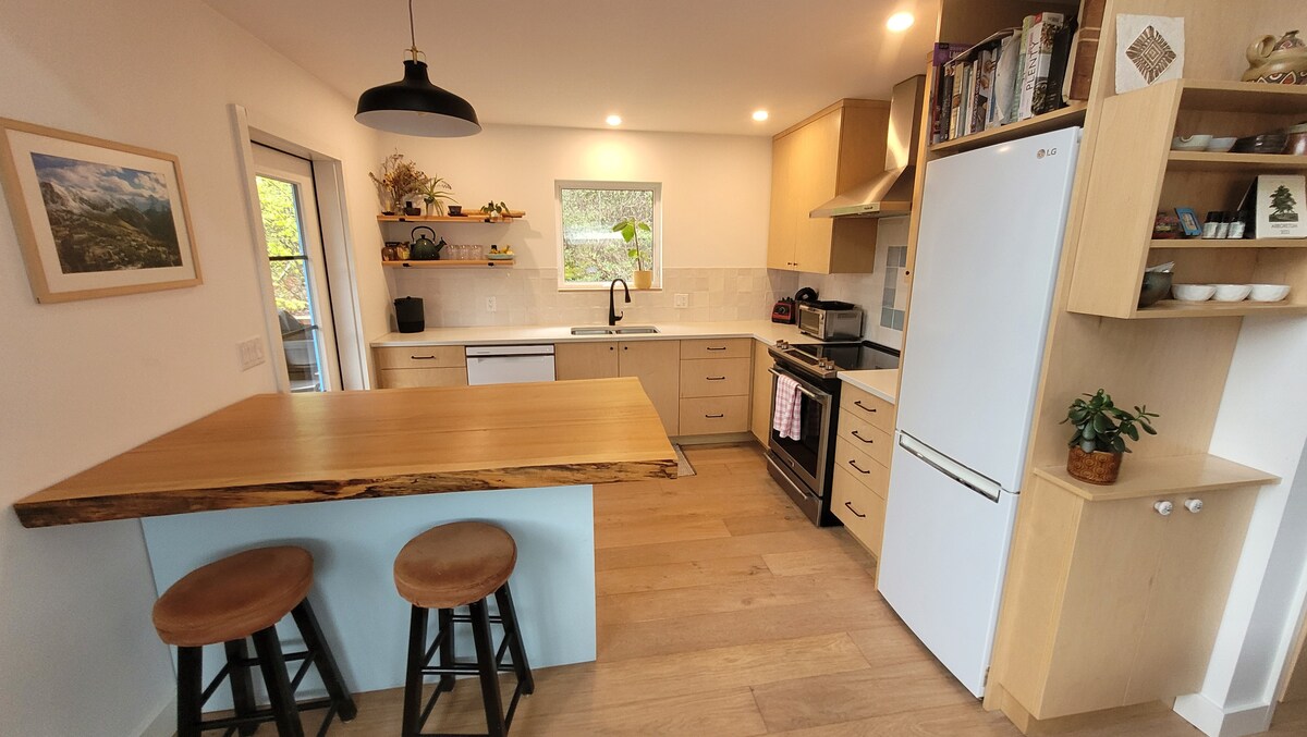 The Treehouse in bonnington Falls is a stylish & cozy getaway and home base for your outdoor adventures 15 minutes away from Nelson. Enjoy a relaxing night next to the fire and cooking or barbecuing in a fully equipped kitchen. Settle in for a peaceful night sleep in the master king bed or guest queen bed. Take in the exceptional views of the surrounding mountains and treetops while relaxing in the jacuzzi spa hot tub on the rooftop patio.