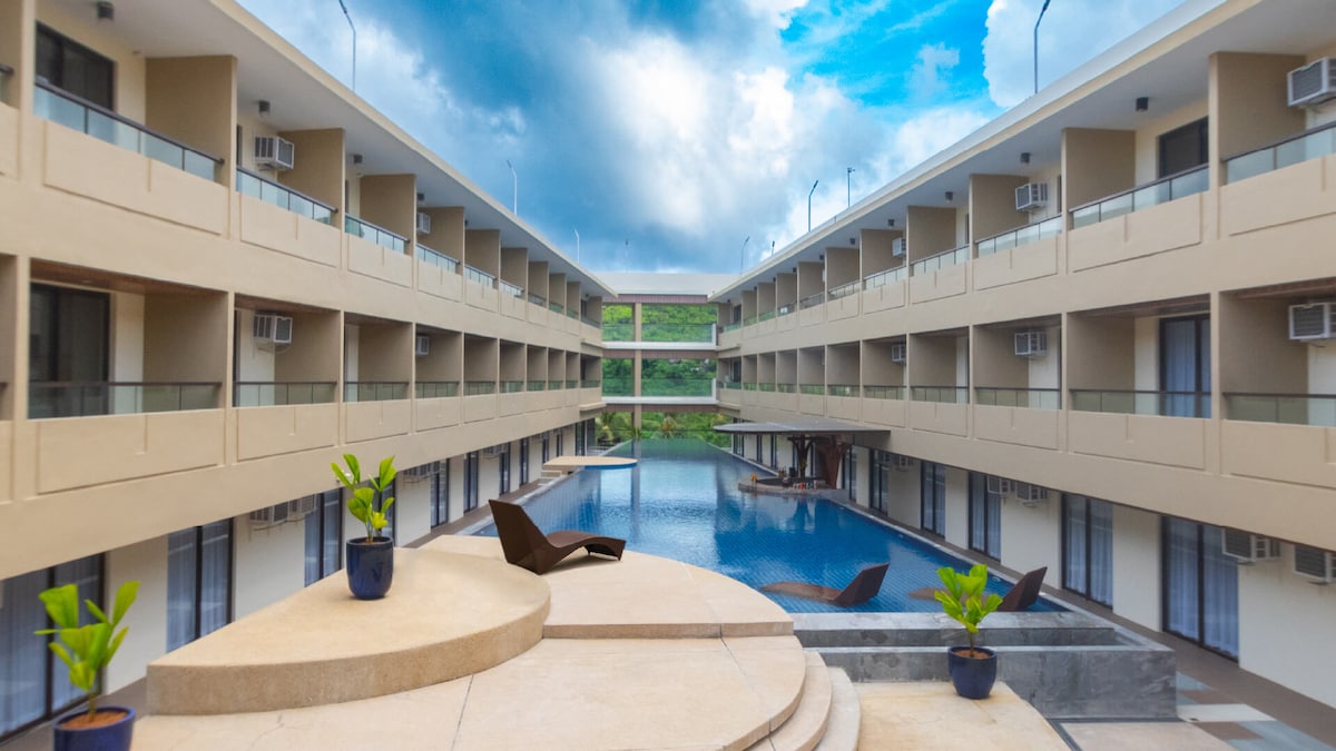 Estamos ubicados en la estación 1, a solo 1 minuto a pie de la playa/Starbucks, a 5 minutos a pie de la estación 2 D 'mall, muchos restaurantes/bares/tiendas están cerca, ubicación muy conveniente pero zona súper tranquila. Nuestro edificio se llama CiNta Hotel, un pequeño hotel dulce y encantador, recién inaugurado en 2024. Total de 2 pisos y 5 habitaciones. La azotea es un restaurante y bar. Esta habitación no tiene balcón, pero muchas áreas públicas, también uso gratuito de mesas al aire libre en la azotea, pueden relajarse con amigos donde quieras.
