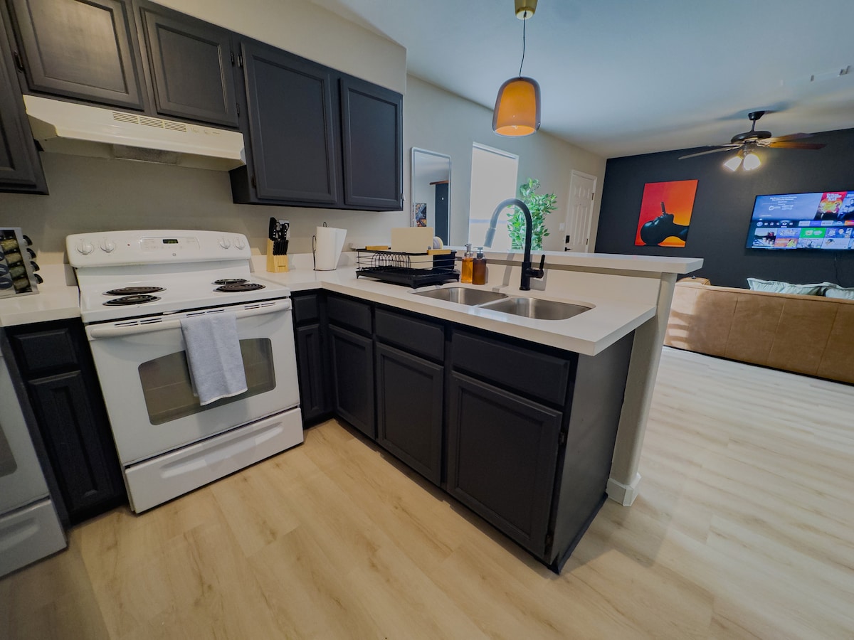 ¡Has encontrado tu hogar lejos de casa! Nuestro apartamento de lujo, cerrado y céntrico cuenta con una espaciosa suite principal completa con una cama tamaño king con la parte superior acolchada, vestidor y baño en la suite. La segunda suite está equipada con una cama tamaño queen de felpa y un segundo baño completo al otro lado del pasillo. Este departamento bien equipado tiene las comodidades que esperarías de tu hotel favorito con algunos extras agregados para hacerte sentir como en casa. ¡Privado, tranquilo y ubicado cerca de restaurantes, el centro comercial, tiendas y HEB!