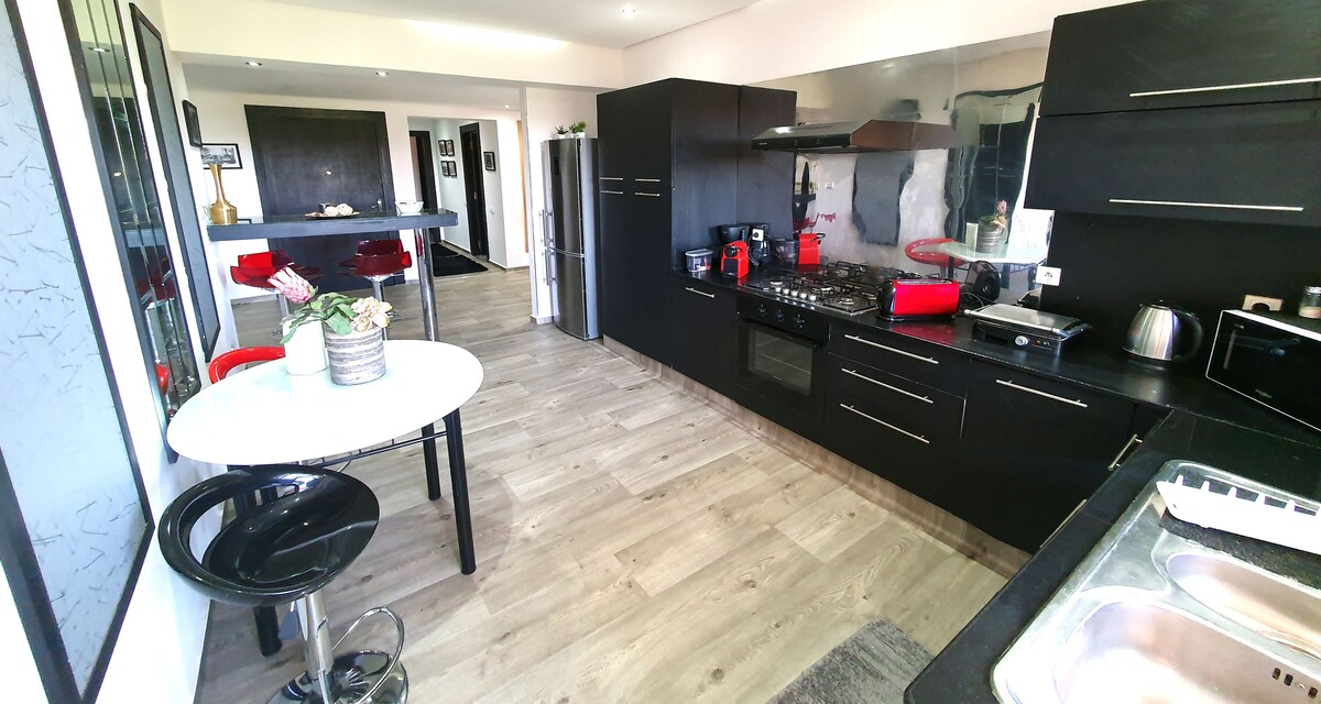 Vue imprenable sur les montagnes de l'Atlas, couchez de soleils et vue sur l'ancienne médina, décoration chaleureuse, qualité de literie et linge de maison, c'est ce qui vous attend dans cet appartement de 110m² situé à proximités des grands axes de la ville. Supermarché, boulangerie et pharmacie en bas de la résidence. Parfait pour les couples, les voyageurs en solo et les voyageurs d'affaires. La ville réalise des travaux aux alentours de l’immeuble.