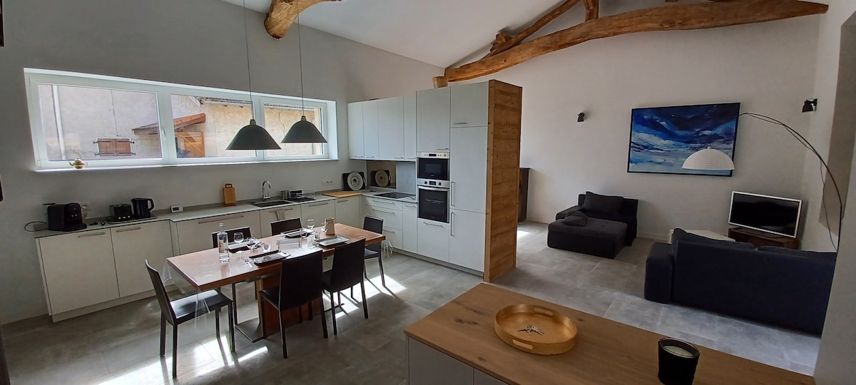 Découvrez un duplex idéalement placé sur les bords du Rhône, au coeur d'un moulin du XV° siècle. Vous y trouverez un gïte récent, propre, confortable, bien équipé et pourvu d'espaces lumineux Entre Lyon, Bourg-en-Bresse, Geneve et Annecy; proche de la PIPA, de la CNPE, de la Via Rhôna; ce duplex s'adresse aux couples, familles ou aux professionnels qui apprécient la proximité et le calme. Le plus ? Un balcon logia équipé d'un bain nordique privé offrant une vue sur les montagnes du Bugey