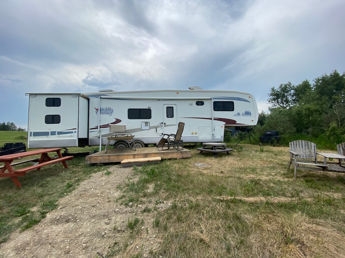 ¡Disfruta de una auténtica experiencia de acampada en una propiedad familiar! Relájate junto al fuego y duerme en los acogedores cuartos de una auténtica autocaravana. Disfrutarás de la experiencia de acampada completa sin ninguna de las Cocina algunos huevos frescos a la mañana siguiente, directamente del gallinero. Algunas vacas pueden deambular cerca en el campo adyacente. Rodeado de hermosas praderas, tendrás tu propio patio privado en nuestro tranquilo campo. Estamos a solo 10 minutos del lago Chestermere y a 25 minutos en coche de Calgary.