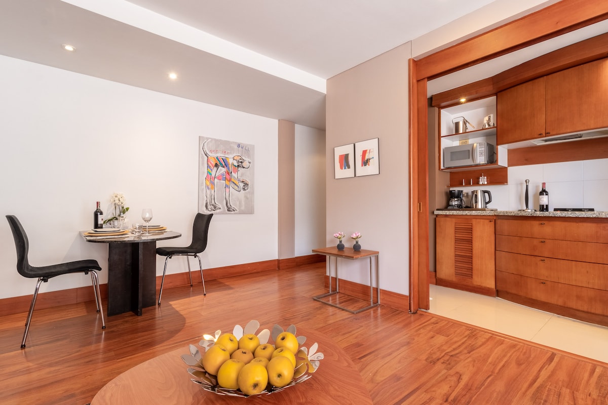 Let yourself be captivated by the serenity of our charming apartment, where the bedroom offers views of a quiet, sunlit street. Featuring a design that seamlessly integrates the living room, kitchen, and dining area into an open and welcoming space, the apartment is known for its warm and bright ambiance. Located just a few meters from the Hilton, JW Marriott, and Four Seasons hotels, in the heart of Quinta Camacho and Zona G, you'll have access to restaurants, cafés, and bars.