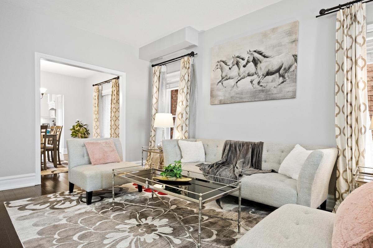 Te damos la bienvenida a nuestra elegante y bellamente decorada casa de 3 dormitorios y 3,5 baños en Brampton, ideal para familias y profesionales, que cuenta con: ✓ Todo nuevo. Perfecto para 6. ✓ Ropa de cama de alta calidad. Camas cómodas. ✓ Cocina totalmente equipada para preparar comidas. Diseño ✓ moderno con un diseño de concepto abierto ✓ Acogedora habitación familiar Internet ✓ de alta velocidad Barrio ✓ seguro. Fácil acceso a la autopista 410/401 ✓ Restaurantes populares cercanos ¡Reserva tu estadía con confianza y crea recuerdos inolvidables!