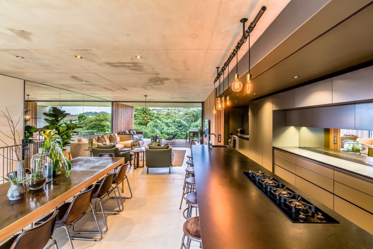 Hermosa casa de playa de estilo californiano con vistas al océano Índico. Observa a los delfines jugar todas las mañanas desde la comodidad de la casa o el área de la piscina o da un paseo de 5 minutos por el sendero privado de la playa que te lleva a una playa tranquila y aislada si te apetece nadar o relajarte en la playa. El dormitorio principal con baño se encuentra en el nivel superior, dos dormitorios en el nivel inferior y dos más en el nivel del entrepiso. Perfecta para familias o amigos que buscan una escapada relajante.