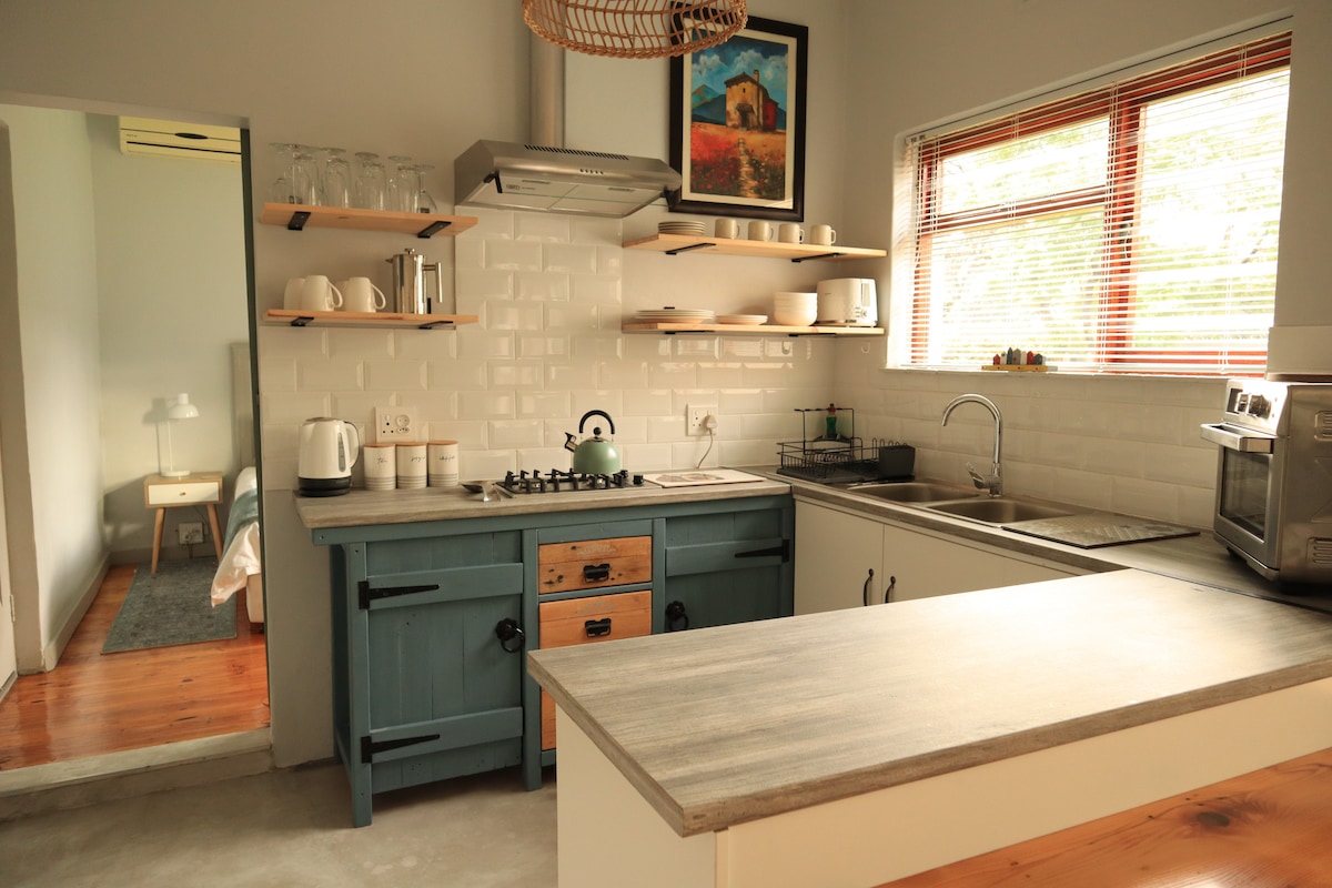 ¡Ven y quédate en nuestra tranquila casa de campo tipo estudio en lo alto de la montaña Helderberg, rodeada de árboles, y escucha el ulular de los búhos mientras te duermes! Hermosa casa de campo nueva, con su propia terraza y jardín y elegantemente amueblada para satisfacer todas tus necesidades. Y ahora con la instalación solar (abril de 2023) ¡NO TENEMOS REDUCCIÓN DE CARGA! Hemos reemplazado el horno y la placa por una cocina de gas para que todos los electrodomésticos se puedan utilizar durante los cortes de energía.