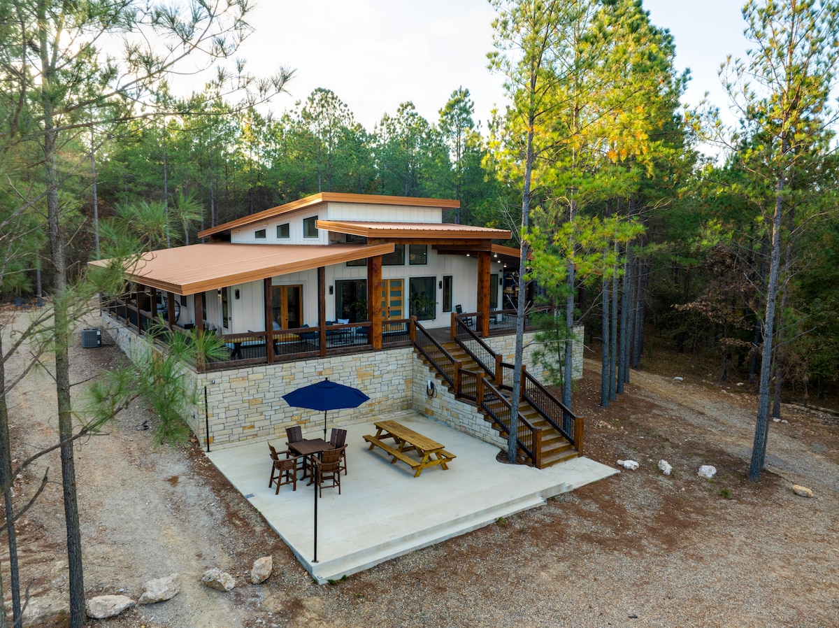 Bienvenido a The Timber Haus, un refugio elevado de 4 dormitorios para un máximo de 16 huéspedes. Disfruta de un spa privado de doble temperatura, una cancha de pickleball iluminada, un refinado salón de juegos, muebles de diseño y una vida al aire libre con dos chimeneas y césped para jugar. Los interiores cuidadosamente diseñados, la cocina de un chef y la arquitectura de madera crean un escape pulido pero acogedor a minutos de Broken Bow Lake y Hochatown. Es posible que se apliquen tarifas de temporada para fechas seleccionadas.
