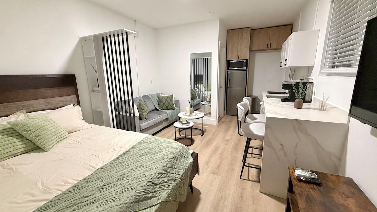 Disfruta de un loft moderno inspirado en el océano a pocos pasos de Hollywood Beach, un refugio relajado para parejas o familias pequeñas. - Capacidad para 2 personas | 1 dormitorio | 1 cama | 1 baño - A pasos de Hollywood Beach y Boardwalk. - Cocina pequeña moderna con estufa y mininevera. - TV Roku de 40 pulgadas en una acogedora sala de estar. - Escritorio y silla de oficina abiertos para trabajar o estudiar. - Lavandería y lavadora/secadora compartidas que funcionan con monedas. - Cuna, silla alta y juguetes disponibles sin costo adicional.