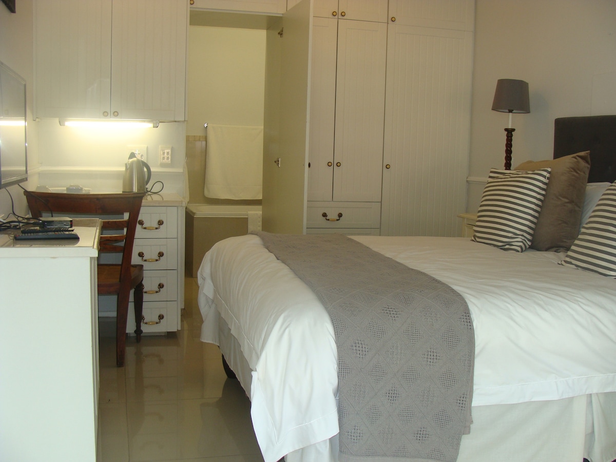 Excelente ubicación a 15 minutos de Sandton, a 15 minutos del aeropuerto y a poca distancia a pie del centro Flamingo. Estudio con jardín decorado con estilo en una finca segura y exclusiva con entrada privada. Cómoda cama tamaño queen y baño en suite. Se proporcionan café instantáneo y té y también tienes acceso a equipos básicos para preparar comidas sencillas, ya que la habitación incluye nevera, microondas, hervidor de agua, tostadora, cocina de inducción y cubiertos básicos (sin horno). Siéntete como en casa en este paraíso privado y seguro.