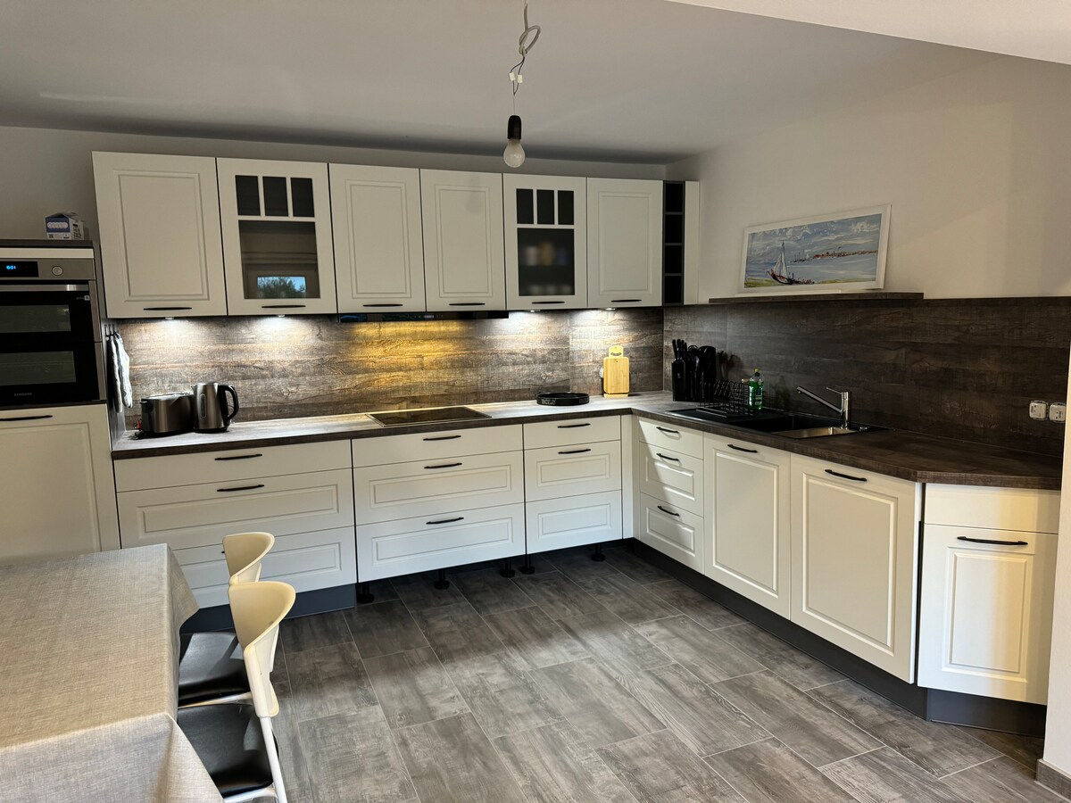 ¡Bienvenidos! Os espera un pequeño estudio de diseño moderno en el entresuelo de una casa de dos familias. La cocina está equipada con todo lo necesario: cafetera de cápsulas, hervidor de agua, microondas, vitrocerámica y nevera. La vista da a nuestro hermoso jardín, donde se pueden aparcar las bicicletas. El coche se puede aparcar justo delante de la casa. En 10 minutos se está en bicicleta en el hermoso centro de la ciudad o en 15 minutos en el lago más cercano. ¡No es una ubicación céntrica!