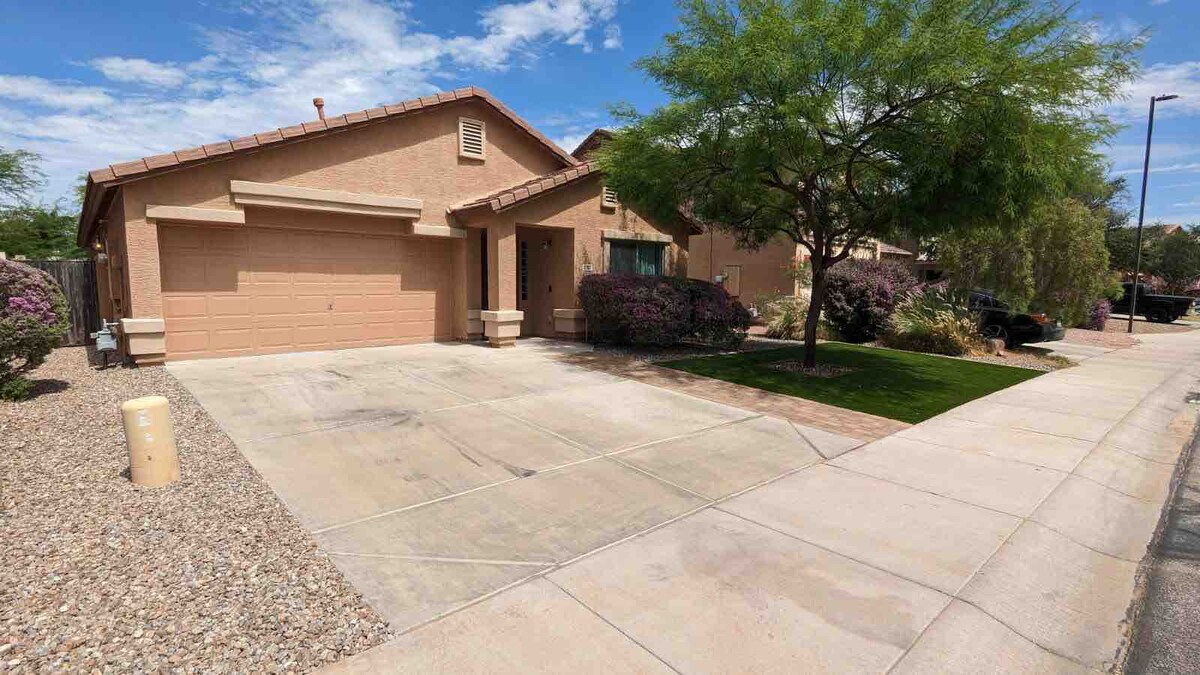 Bienvenido a esta espaciosa y moderna casa de 4 dormitorios y 2 baños ubicada en la comunidad de Tartesso en Buckeye, AZ. Se encuentra a 15 minutos de cualquier restaurante/tienda, pero hay camiones de comida todos los días en la comunidad. • A 25 minutos de la estación de generación de Palo Verde. • Cocina moderna y surtida con electrodomésticos y una variedad de especias disponibles. • Lavandería equipada con detergente. • Camas y almohadas cómodas • Televisión inteligente con Netflix, Disney+ y mucho más • Plancha/tabla de planchar y vaporizador disponibles.