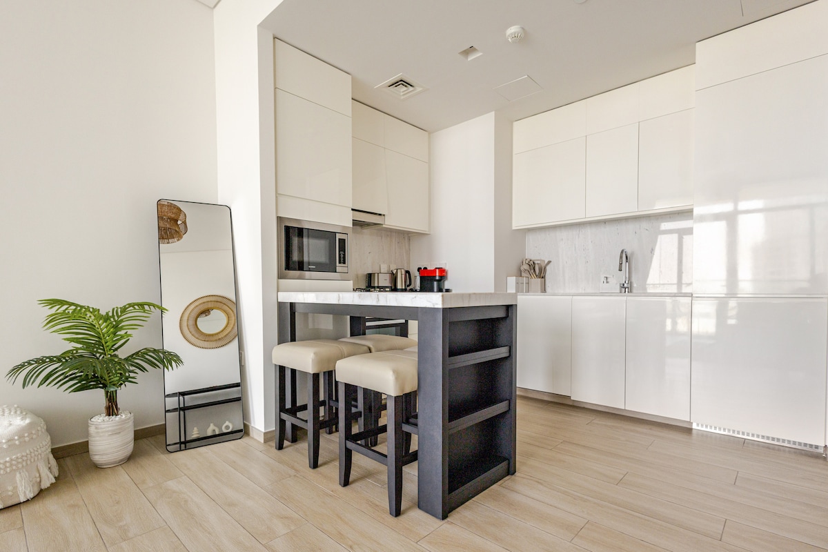 Elegante 1BR con vista al horizonte de Dubái y Burj Khalifa