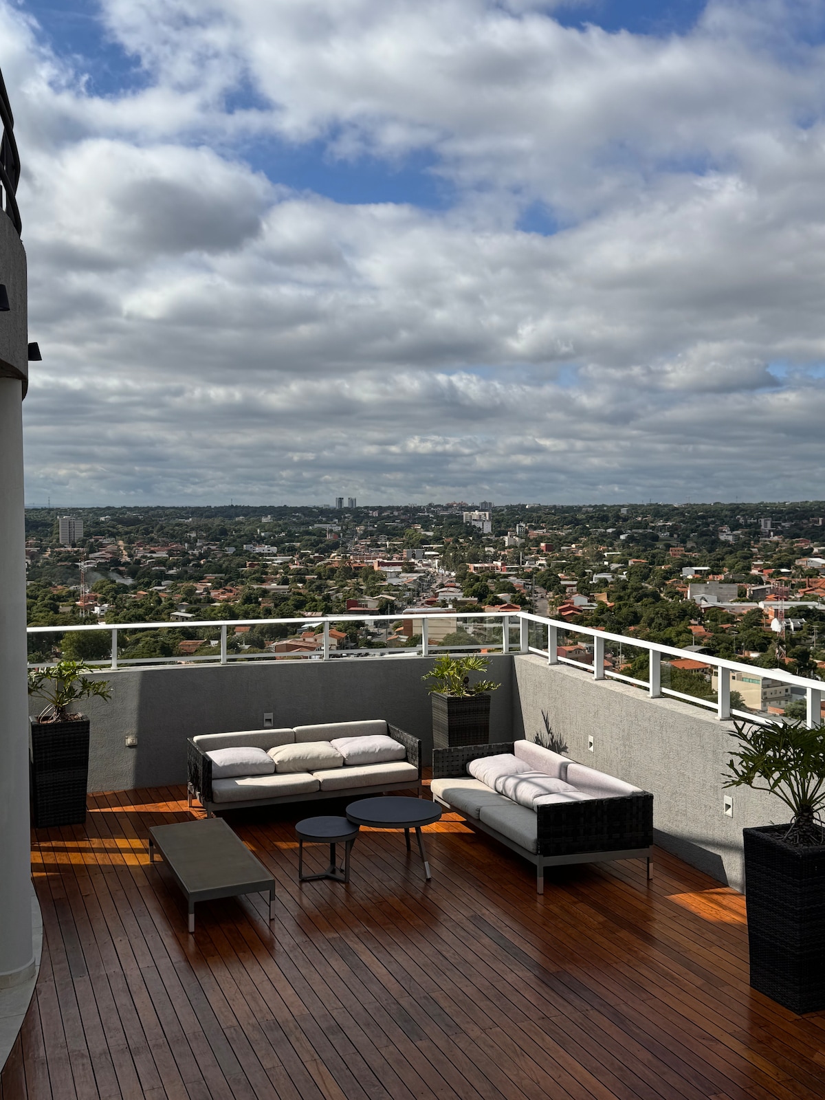 Exclusivo departamento en el último, 16vo piso con terraza privada. Excelente ubicación en la zona vip residencial de Asunción. Terraza privada con parrilla, comedor exterior para 8 personas y área de estar. Vista panorámica de la ciudad y atardecer en la Bahía. Cuenta con un dormitorio matrimonial súper king en suite con TV Smart y servicio de TV Cable. Otra habitación doble en suite, y una habitación pequeña con sofá cama, que cuenta solo con ventilador y baño enfrente.