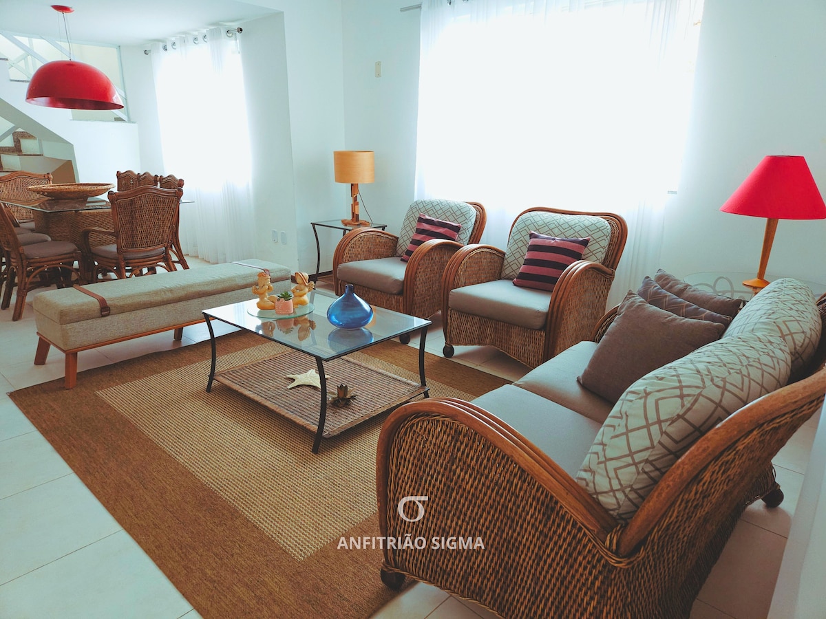 Disfrute con su familia de este elegante y cómodo lugar en la Playa de Manguinhos, directamente en la arena. Camine un poco por la playa y encontrará una senda que conduce a la impresionante Playa da Tartaruga, ¡es hermosa! O diríjase al Porto da Barra, donde podrá gozar de los restaurantes más populares del balneario y relajarse con caipirinhas. Para los niños, además de la piscina climatizada y el césped, hay acceso directo a la playa desde la casa y un campo de fútbol que se va andando.