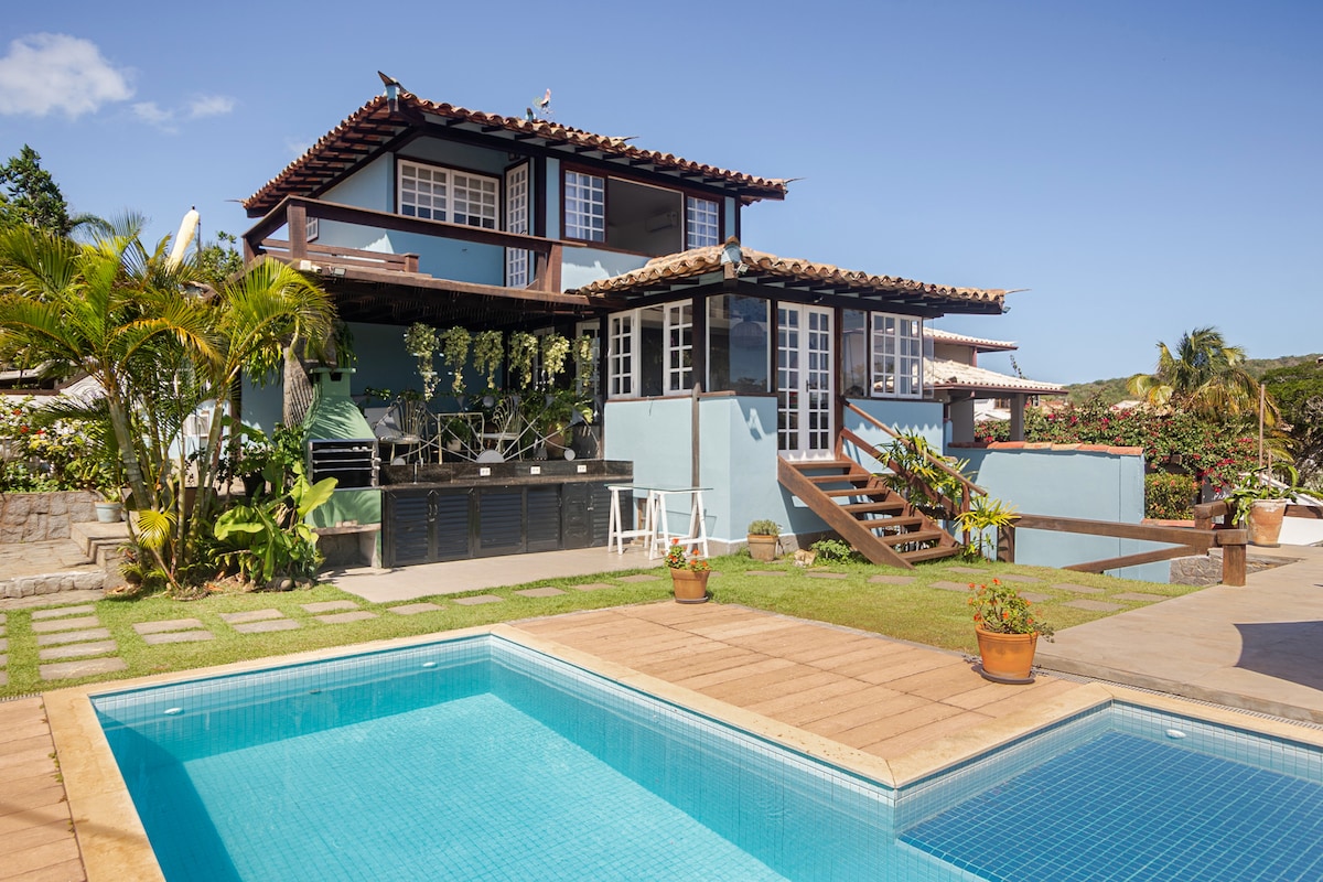Aquahouse ,una de las mejores vistas de Buzios, sobre la playa de Ferradurinha El concepto arquitectónico fue concebido para poder disfrutarla con intimidad 2 o 4 parejas o en familia.Precio x 6 adultos es el publicado , capacidad 10 personas Persona adicional $R200 por día . piscina y jacuzzi ( sin climatización protagonistas de esta obra magistral de arquitectura. Son 4 1/2 suites en total, siendo 3 suites con cama doble e 1 suite master com cama Super King+ 1 cuarto adicionado . Pet $R400