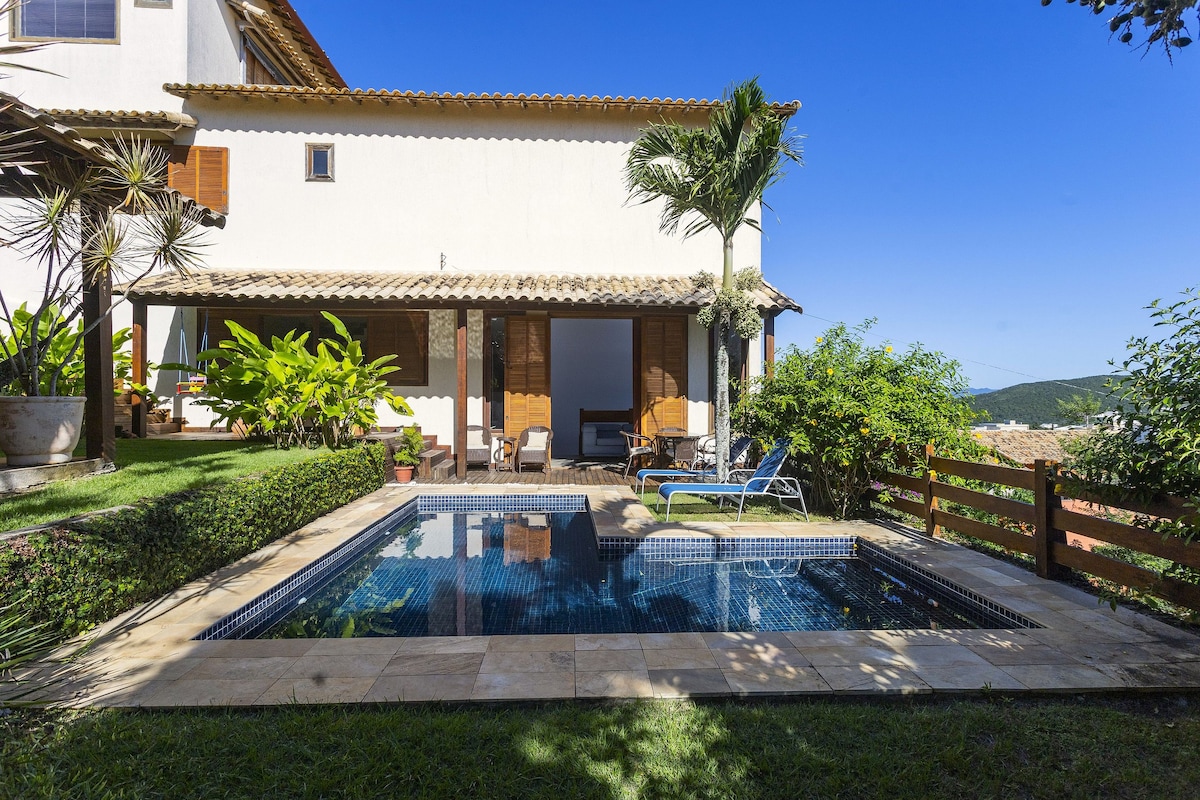 Casa muy bien cuidada y completa, con un maravilloso espacio de ocio con una hermosa piscina en cascada, hidromasaje, barbacoa, mesa de billar y sala de juegos. Construcción en dos plantas, la inferior con cocina completa, área de servicio, baño, 2 suites, lavabo, comedor y sala de televisión. Planta superior con 2 suites, sala de cine y sala de juegos. Lleva a toda la familia a este gran lugar con mucho espacio para divertirse, cerca de la playa de Ferradura y a 4 minutos del centro de Búzios.