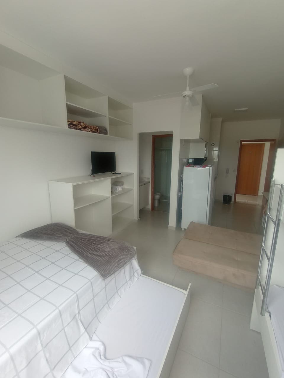 Estudio en el condominio da Fé al lado de la canción Nova. Todo pensado para el bienestar de la familia con muebles y utensilios totalmente nuevos. Hay 2 camas: 1 cama doble y una litera con auxiliar Tenemos almohadas, sábanas 100% algodón, toallas, mantas, ventilador y televisión. Mesa de comedor para 4 personas, minibar, microondas, cafetera, sandwichera, utensilios.