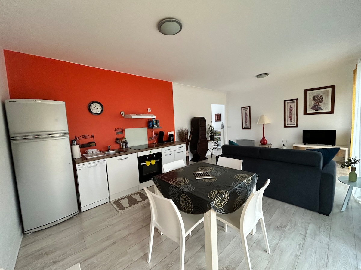 Apartamento T2 de 50 m2 fuera de la residencia con acceso independiente (solo en el 1er piso). Tranquilo, luminoso, espacioso, funcional y con aire acondicionado. Sala de estar con cocina totalmente equipada + comedor + sala de estar con sofá cama y TV + balcón amueblado. 1 dormitorio con cama Queen Size Cuarto de baño con ducha y lavadora. Estacionamiento privado y gratuito en el lugar. Ubicación ideal para visitar Burdeos y su región: En coche a 15 minutos del centro de Burdeos, a 40 minutos de la bahía de Arcachón y a 45 minutos de Saint-Emilion.