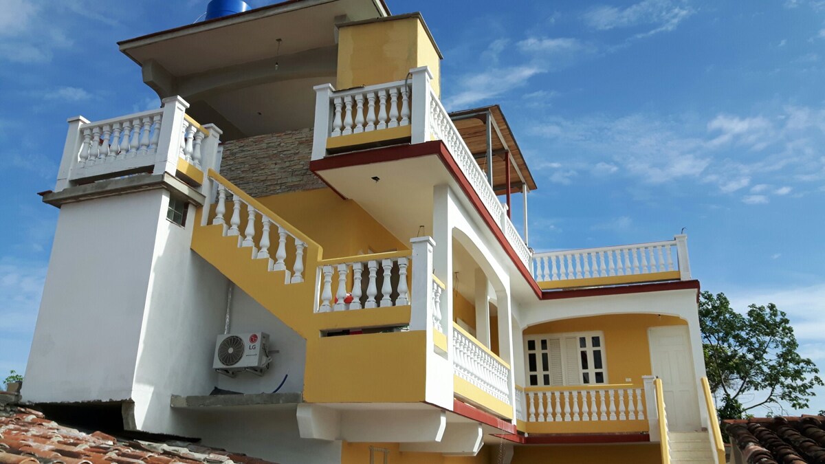 Casa Colonial del 1895 , situada a 100 metros de la Plaza Central. Con 6 grandes habitaciones climatizadas con su baño interior en cada una. Estancia en familia . Hall, 2 Salas y Comedores para los Huéspedes con un hermoso patio con portal y plantas, terraza techada en el segundo piso y terraza amplia en el tercer piso con una hermosa vista de la ciudad. Tenemos acceso a internet a través de wifi y se habla Inglés. A solo 40 minutos de cayo Santa María.