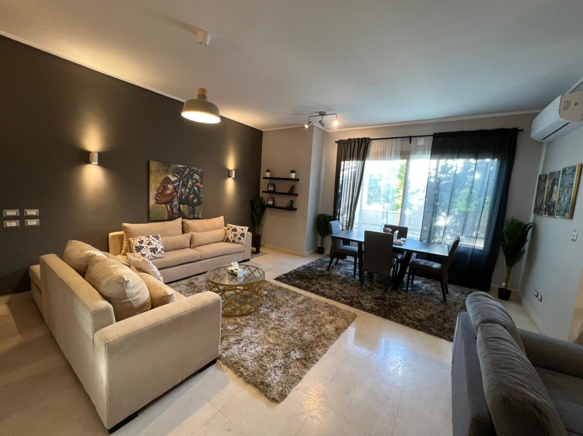 Overlooking the most spectacular waterscape in a gated community in New Cairo, this 3bdrm apartment has a luxurious rustic feel. It features a cozy living room, dining space, a fully-equipped kitchen and a spacious terrace. The master bedroom has its own ensuite bathroom, two bedrooms share a bathroom, in addition to a guest toilet and separate laundry space.