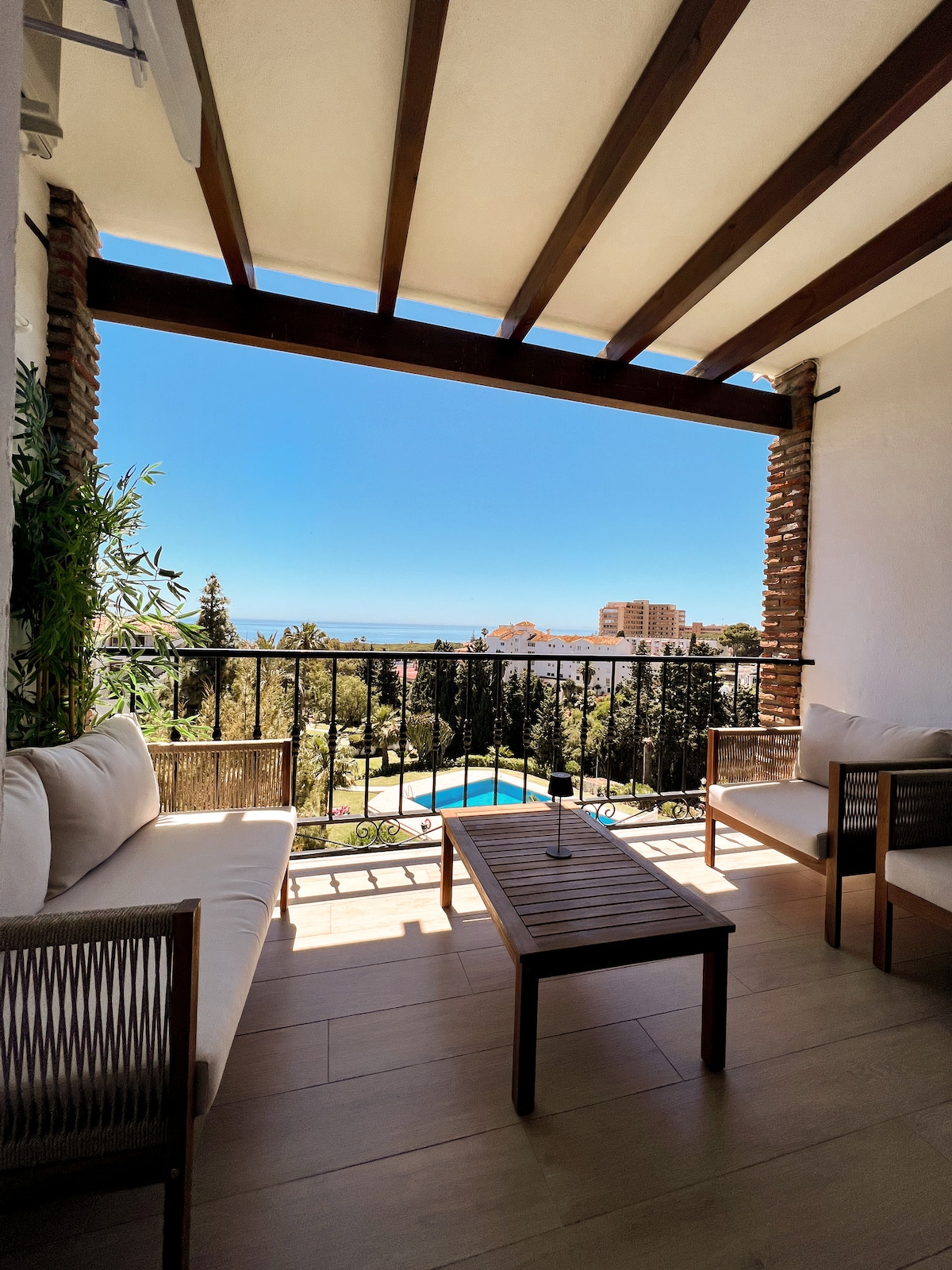 Cozy, bright, entirely renovated quality flat on the front line with sea views from the sunny and large balcony, both rooms and the bathroom. Features his and her shower, full kitchen, 2 tennis courts, 2 swimming pools (1 for children) large gardens, private beach area, free beach beds and private parking. We have a sandy beach with Blue Flag status and direct access to the sea boardwalk. Near Marbella and La Cala with 75+ restaurants and many shops walking distance. Strict cleaning protocols.