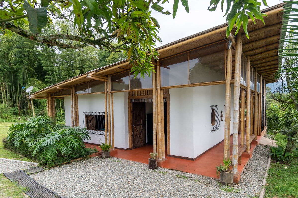 Ubicada en la región cafetera, en las montañas andinas de Colombia, Sudamérica, una encantadora cabaña hecha de bambú, con unas vistas estupendas y un "sendero" o camino a través del bosque de bambú que cruza nuestra granja orgánica de 5 acres, que conduce a un arroyo. Un lugar para relajarse y comunicarse con la naturaleza. Por favor, ten en cuenta que el precio indicado es para una persona. Por favor, selecciona el número correcto de huéspedes cuando reserves la cabaña. El segundo huésped tiene un cargo de $ 20 por noche adicional de $ 20 por noche. El desayuno está incluido.