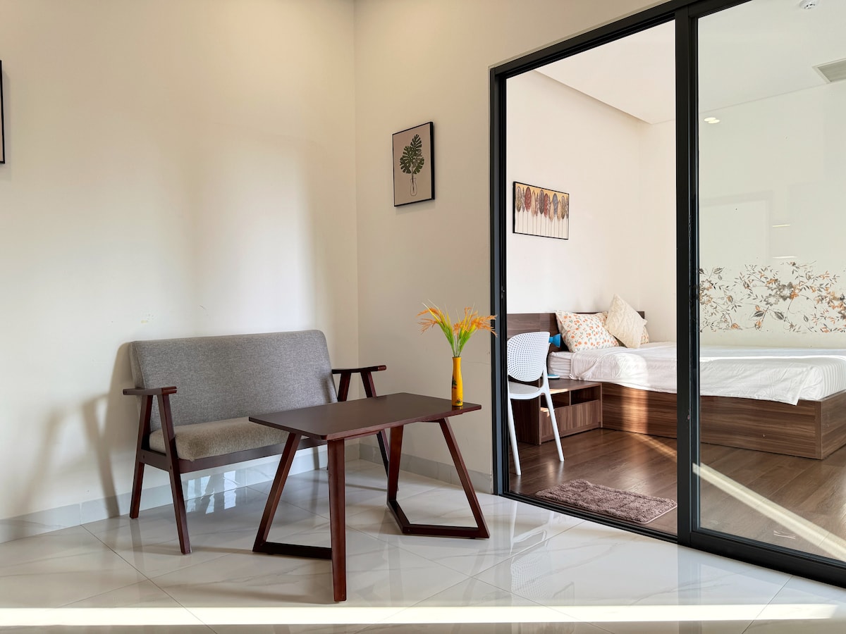 Ubicado en el piso 15 de Monarchy, este apartamento de 80 m² ofrece vistas panorámicas del horizonte de Da Nang y del puente Tran Thi Ly. Diseñado con detalles dorados, madera natural y texturas tejidas, es un refugio alegre y estimulante para estadías prolongadas. Cocina en la cocina totalmente equipada, lava la ropa en la unidad y relájate en la piscina después de un día de trabajo o paseos junto al río. Con cafés, mercados y mercados a pocos pasos, esta residencia combina comodidad y comodidad para estancias largas. ✨ ¡DESCUENTOS ESPECIALES PARA ESTADÍAS LARGAS!